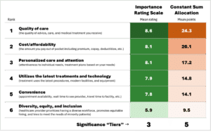 Quality of care is seen as most important regardless of methodology, however, 4 of the 5 other drivers are statistically similar with the rating scale and we are not able to definitively determine the ranking. More discrimination is clearly shown between the drivers when using constant sum allocation – there are more “tiers” among the drivers based on significant differences. We can see that Cost/affordability is more important to customers than Personalized care, and both are more important than Utilizes the latest treatments and Convenience, a level of detail that we don’t get from the importance scale ratings. For similar situations to these, it’s worth using constant sum instead of rating scales for more discrete results which can lead to better prioritization for messaging, product features, resource allocation, or other key business concerns.